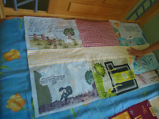 Os professores foram divididos por grupos de escolas onde atuam e entregue a cada escola um quadro (retalho de tecido) e um fragmento da história, que deveriam ilustrar e transcrever o texto.